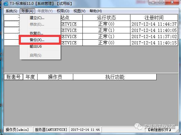 (2)登錄后點(diǎn)賬套下拉菜單 選擇備份 然后選擇準(zhǔn)備年結(jié)的帳套確認(rèn)備份