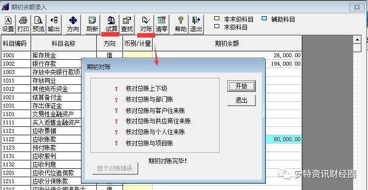 具體步驟:總賬下拉菜單-->設(shè)置-->期初余額-->試算&對(duì)賬。