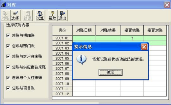 2、在彈出的窗口中,直接按Ctrl+H組合鍵,彈出一個提示“恢復記賬前狀態(tài)功能已被激活”,再點擊〖確定〗按鈕