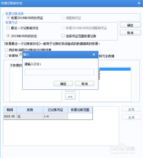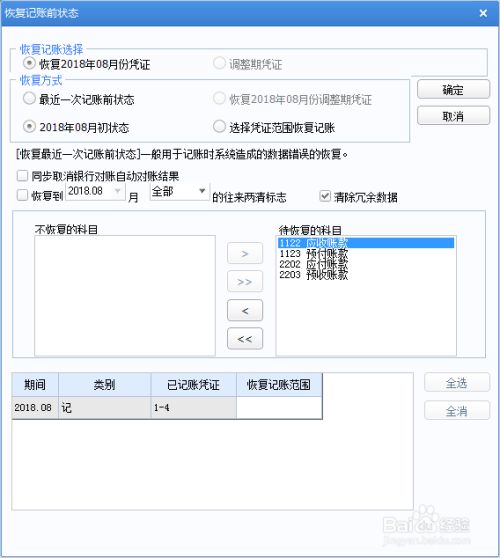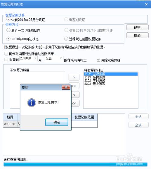 在“恢復記賬前狀態(tài)”窗口中,“恢復方式”下選擇“恢復2018年08月初狀態(tài)”后!點擊“確定”!